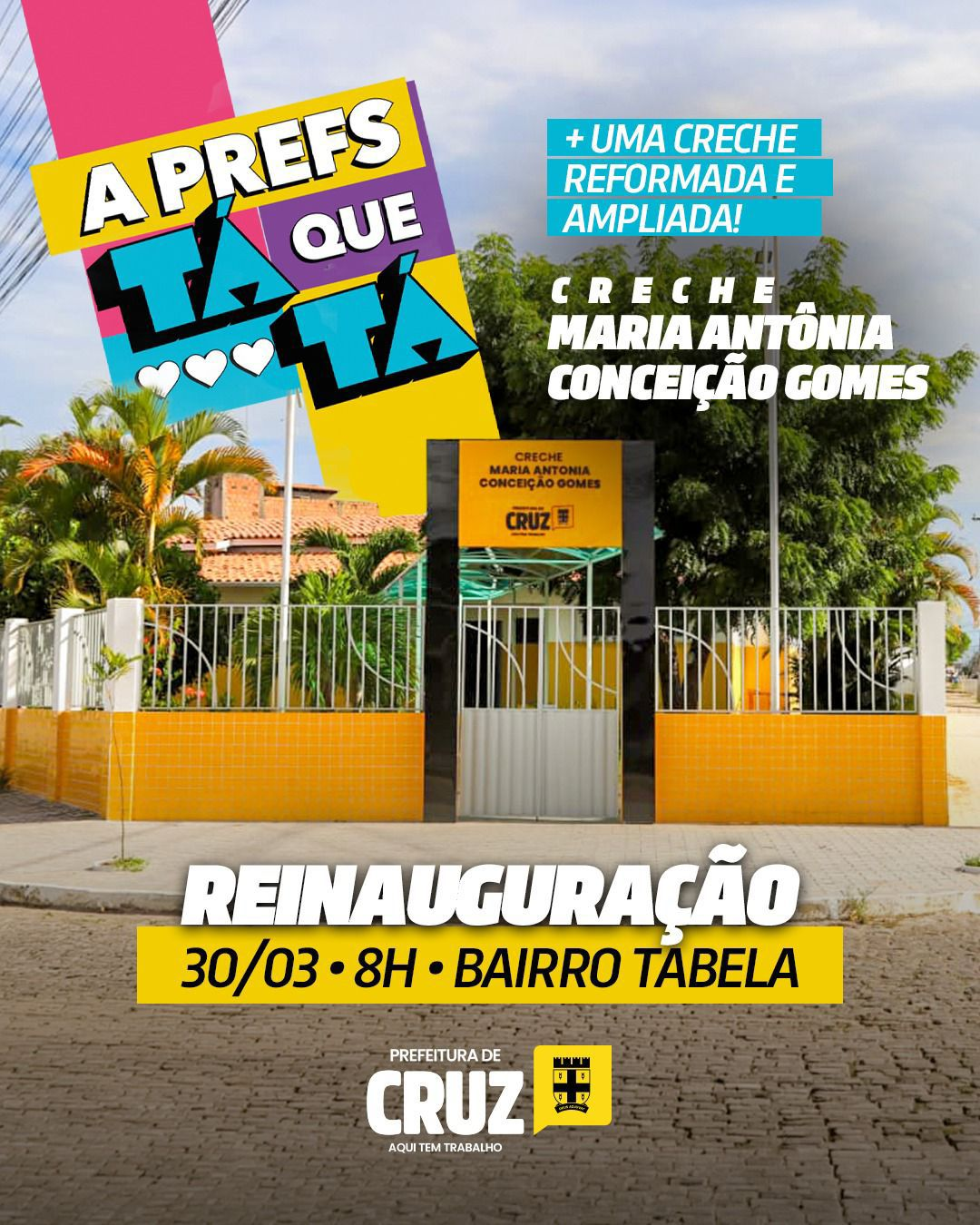 A Prefeitura de Cruz vai entregar ao município mais um espaço educacional de qualidade. A reinauguração da Creche Maria Antônia Conceiçao Gomes, no bairro Tabela ...