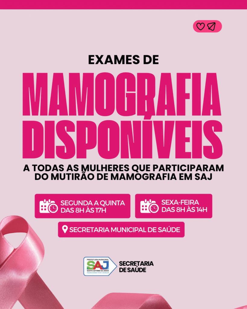 A Prefeitura Municipal de Santo Antônio de Jesus, por meio da Secretaria Municipal de Saúde (SMS), informa à população que os exames de mamografia realizados durante o Mutirão de Mamografia já estão disponíveis para retirada. A ação faz parte do compromisso da gestão com a promoção da saúde preventiva e o cuidado com as mulheres do município.