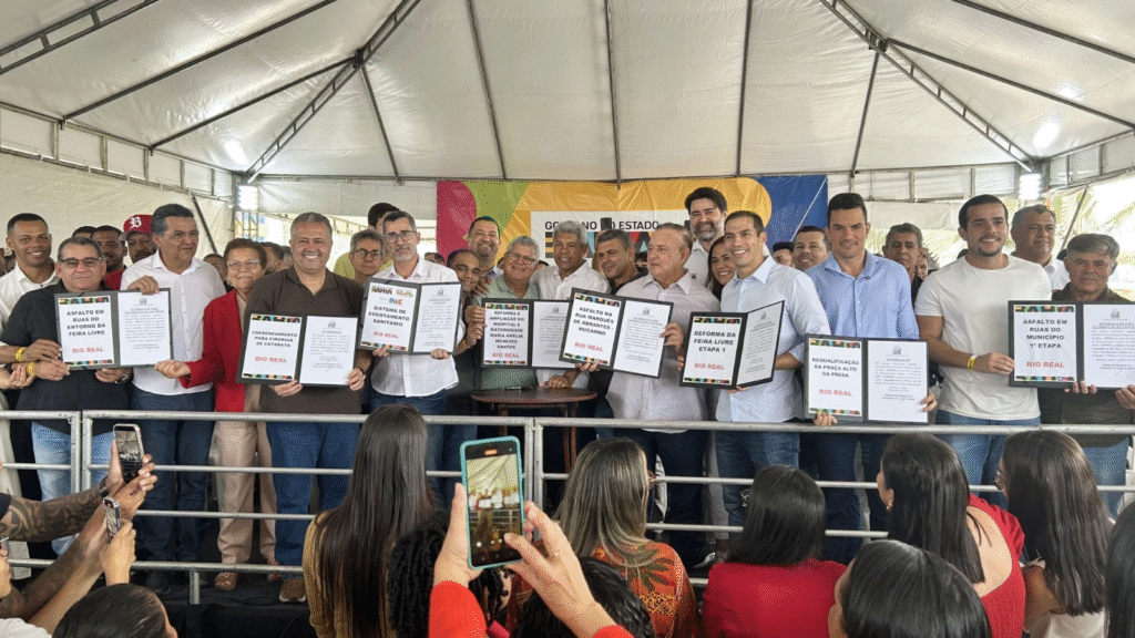 “Autorizei para Rio Real, uma licitação grandiosa de quase R$ 200 milhões, através da Embasa, para o esgotamento sanitário, que vai garantir uma cobertura de 90% do esgotamento aqui da sede, mais saúde e qualidade de vida”, anunciou Jerônimo Rodrigues.
