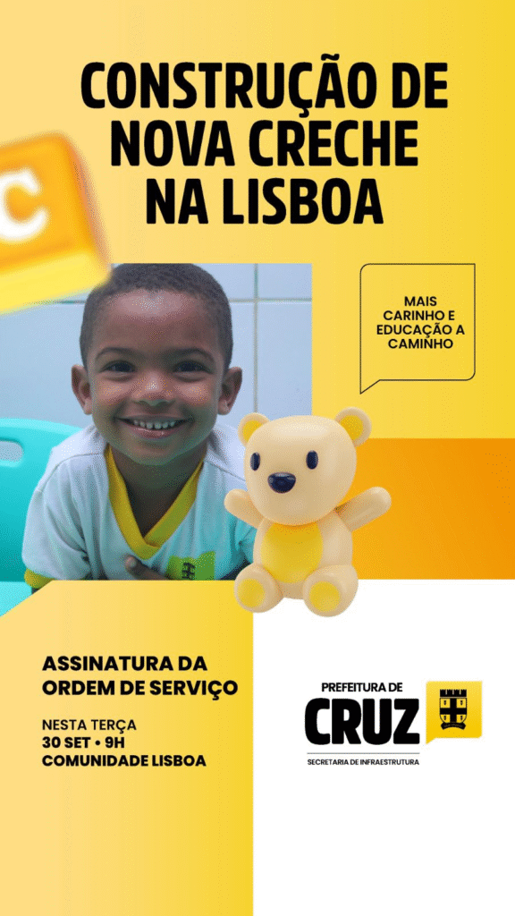 A Prefeitura de Cruz, através da Secretaria de Infraestrutura e Obras Públicas (Seinfra), vai construir uma nova creche na Lisboa. A assinatura da ordem de serviço, que autoriza o início das obras, será realizada pelo prefeito Ednaldo Ribeiro nesta terça-feira (30), às 9h, na própria comunidade.