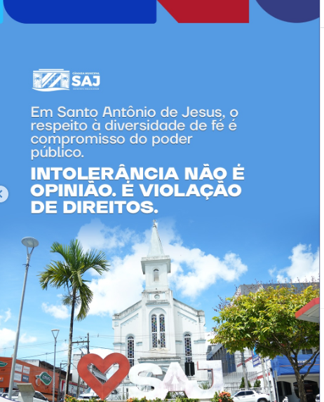 Na tarde desta quarta-feira (21), a Câmara Municipal de Santo Antônio de Jesus utilizou suas redes sociais para lançar uma postagem educativa voltada ao combate à intolerância religiosa. A iniciativa busca conscientizar a população sobre a importância fundamental do respeito aos diversos segmentos religiosos, promovendo a coexistência harmônica na cidade.