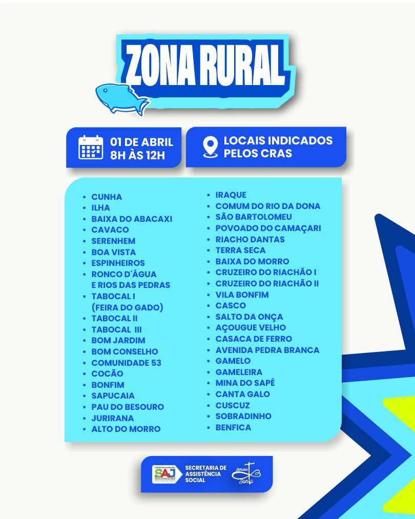 A distribuição na zona urbana acontecerá no dia 31 de março, das 8h às 14h, no Estádio Municipal José Trindade Lobo. Já na zona rural, a entrega será realizada no dia 1º de abril, das 8h às 12h, nos locais indicados pela Secretaria de Assistência Social.