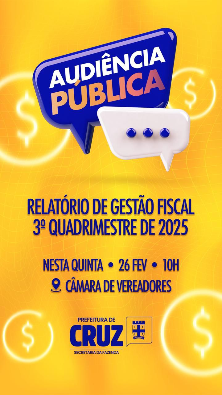 Nesta quinta-feira (26), às 10h, na Câmara de Vereadores, a Prefeitura de Cruz realizará uma audiência pública para apresentação e discussão do Relatório de Gestão ...